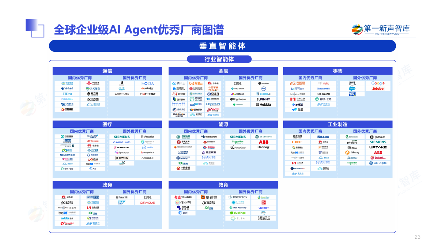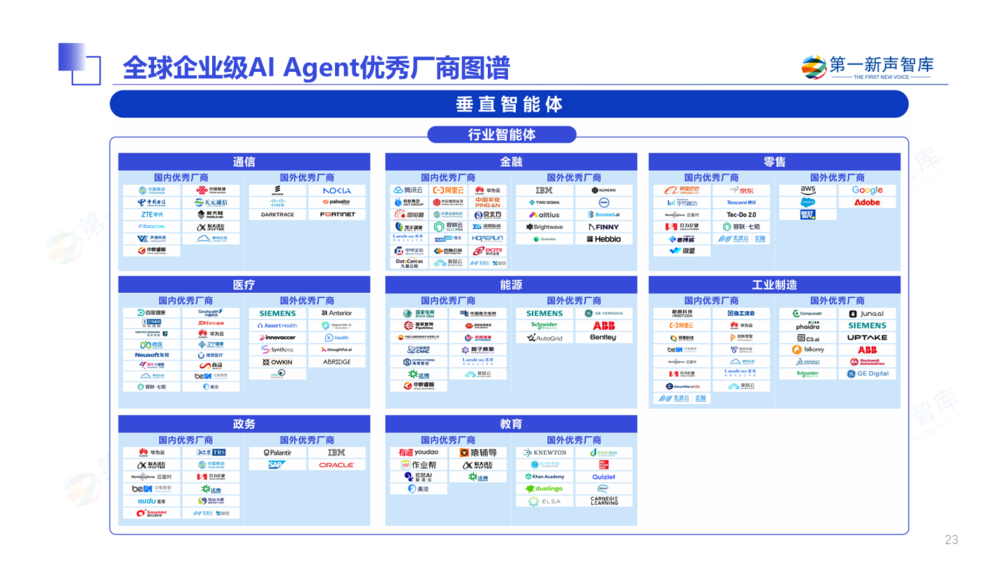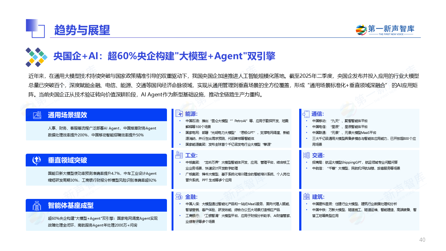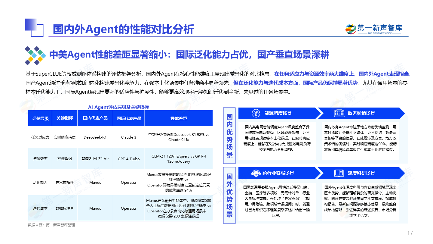 在行业应用层面,AI Agent的价值释放与行业数字化基础、数据成熟度高度相关。AI Agent正在多个关键领域实现从“辅助工具”到“核心驱动”的角色转变。根据第一新声智库研究,AI Agent已走出试验阶段,其应用深度与行业数字化基础高度相关,并在金融、通信等数据密集型行业中率先形成规模价值。