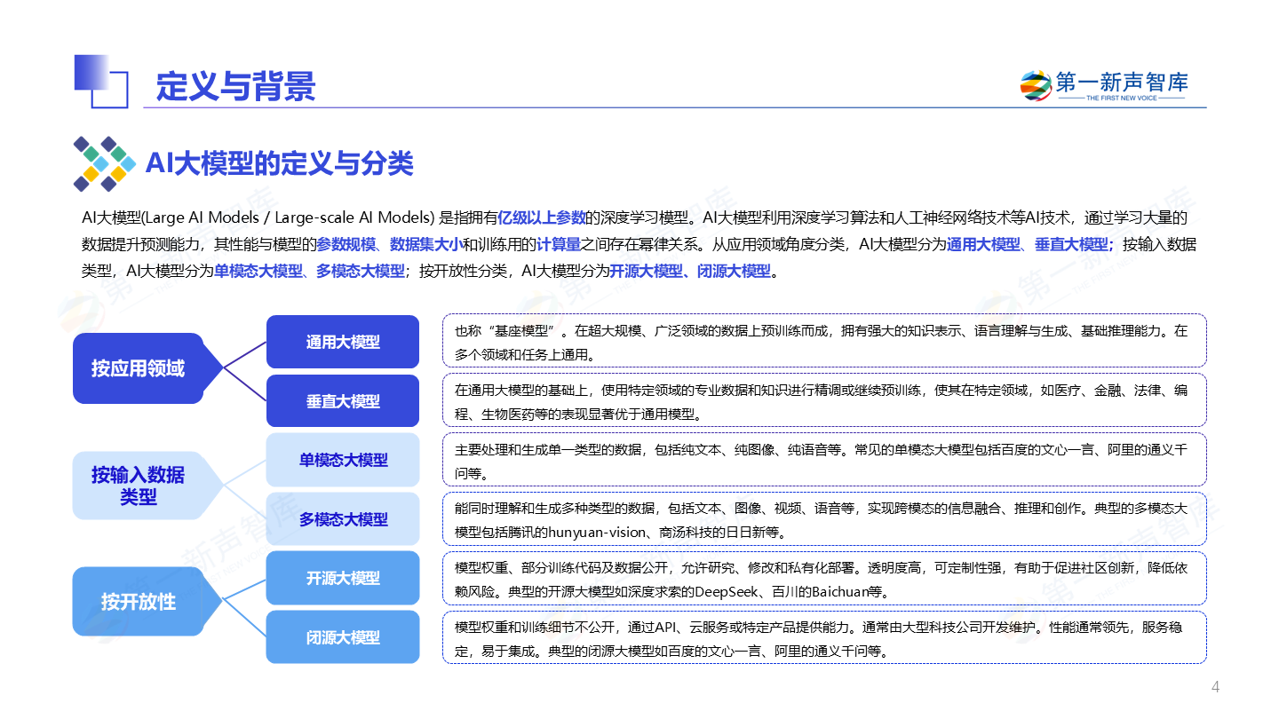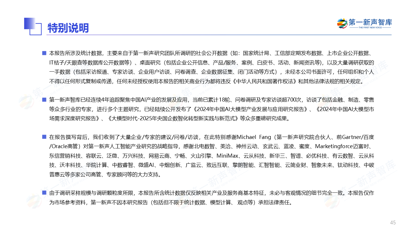 第一新声智库已经连续4年追踪中国AI产业的发展及应用,当前已累计18轮、问卷调研及专家访谈超700次,访谈了包括金融、制造、零售等众多行业的专家,进行多个主题研究,已经陆续公开发布了《2024年中国AI大模型产业发展与应用研究报告》、《2024年中国AI大模型市场需求深度研究报告》(非公开)、《大模型时代-2025年央国企数智化转型新实践与新范式》等众多重磅研究成果。