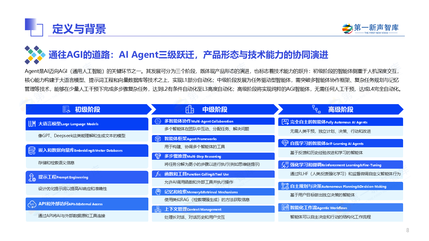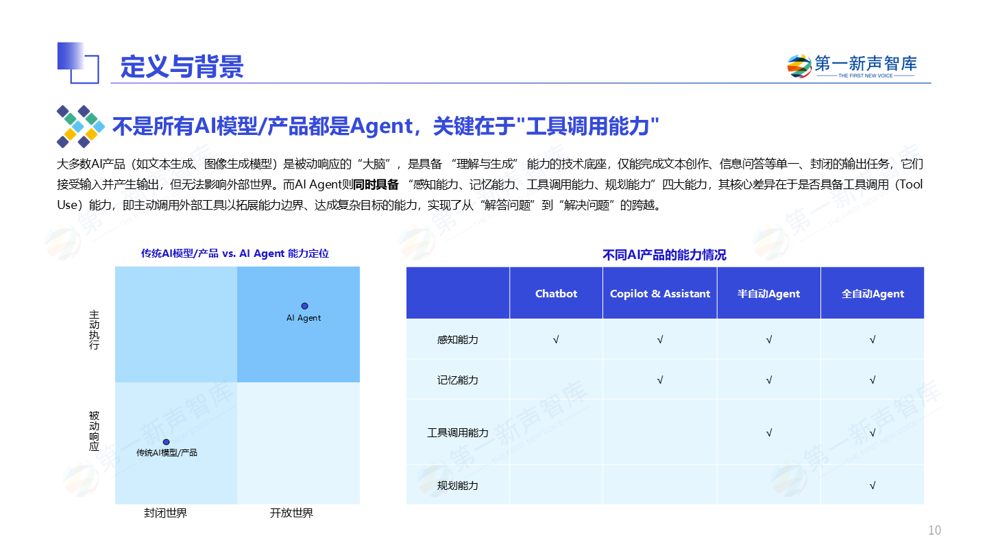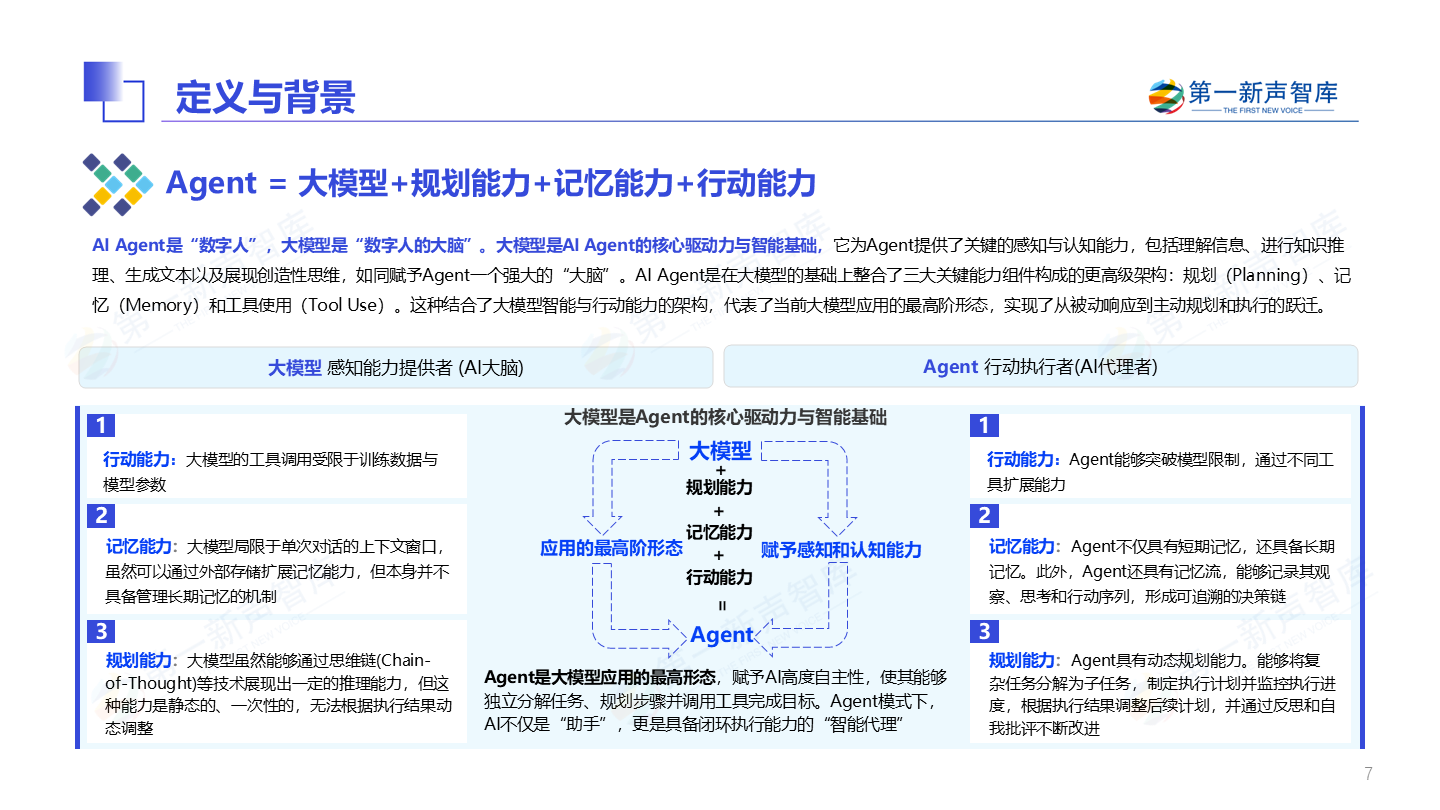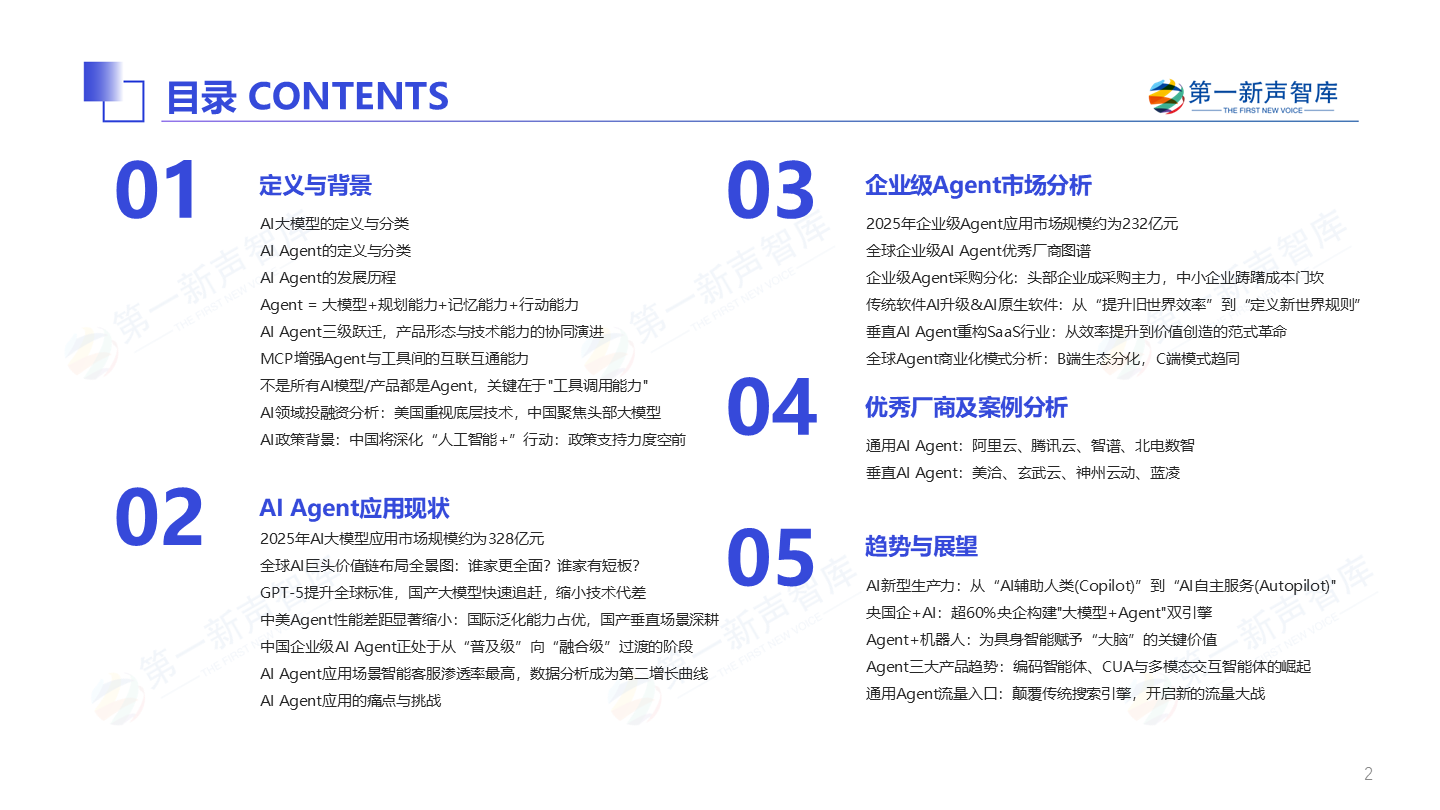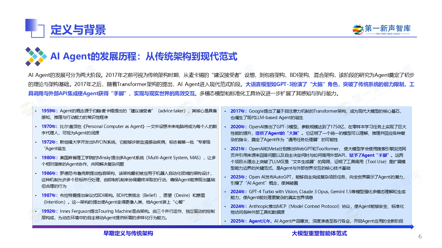本次研究报告的核心是解答三个问题:当前AI Agent的应用走到了哪一步?企业级市场的机会与挑战何在?未来3-5年AI Agent将如何重构产业?本报告从定义与背景出发,系统梳理AI Agent的定义分类、发展历程及与大模型的关系,深入分析AI Agent在中国的应用现状,并对企业级Agent的市场规模、生态格局、采购行为、商业模式进行洞察。