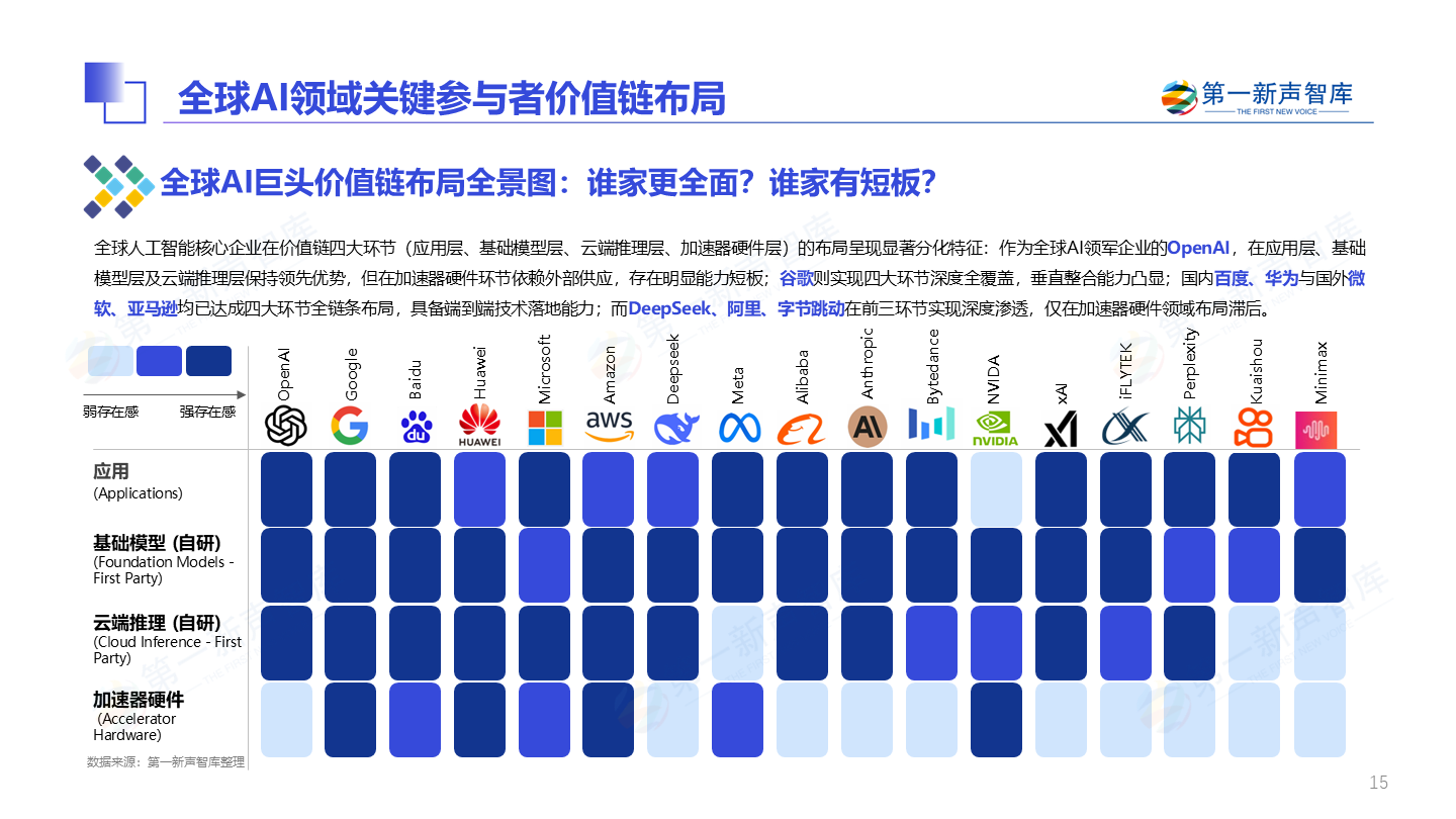 全球人工智能核心企业在价值链四大环节(应用层、基础模型层、云端推理层、加速器硬件层)的布局呈现显著分化特征:作为全球AI领军企业的OpenAI,在应用层、基础模型层及云端推理层保持领先优势,但在加速器硬件环节依赖外部供应,存在明显能力短板;谷歌则实现四大环节深度全覆盖,垂直整合能力凸显;国内多家公司与国外微软、亚马逊均已达成四大环节全链条布局,具备端到端技术落地能力。