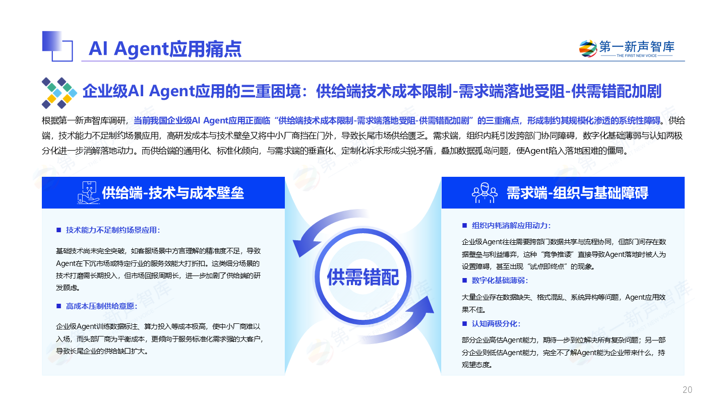 根据第一新声智库调研,当前我国企业级AI Agent应用正面临“供给端技术成本限制-需求端落地受阻-供需错配加剧”的三重痛点,形成制约其规模化渗透的系统性障碍。供给端,技术能力不足制约场景应用,高研发成本与技术壁垒又将中小厂商挡在门外,导致长尾市场供给匮乏。需求端,组织内耗引发跨部门协同障碍,数字化基础薄弱与认知两极分化进一步消解落地动力。而供给端的通用化、标准化倾向,与需求端的垂直化、定制化诉求形成尖锐矛盾,叠加数据孤岛问题,使Agent陷入落地困难的僵局。