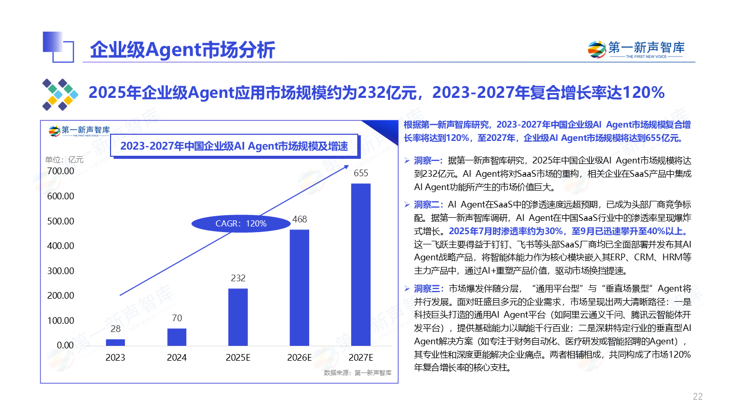 根据第一新声智库研究,2023-2027年中国企业级AI Agent市场规模复合增长率将达到120%,至2027年,企业级AI Agent市场规模将达到655亿元。