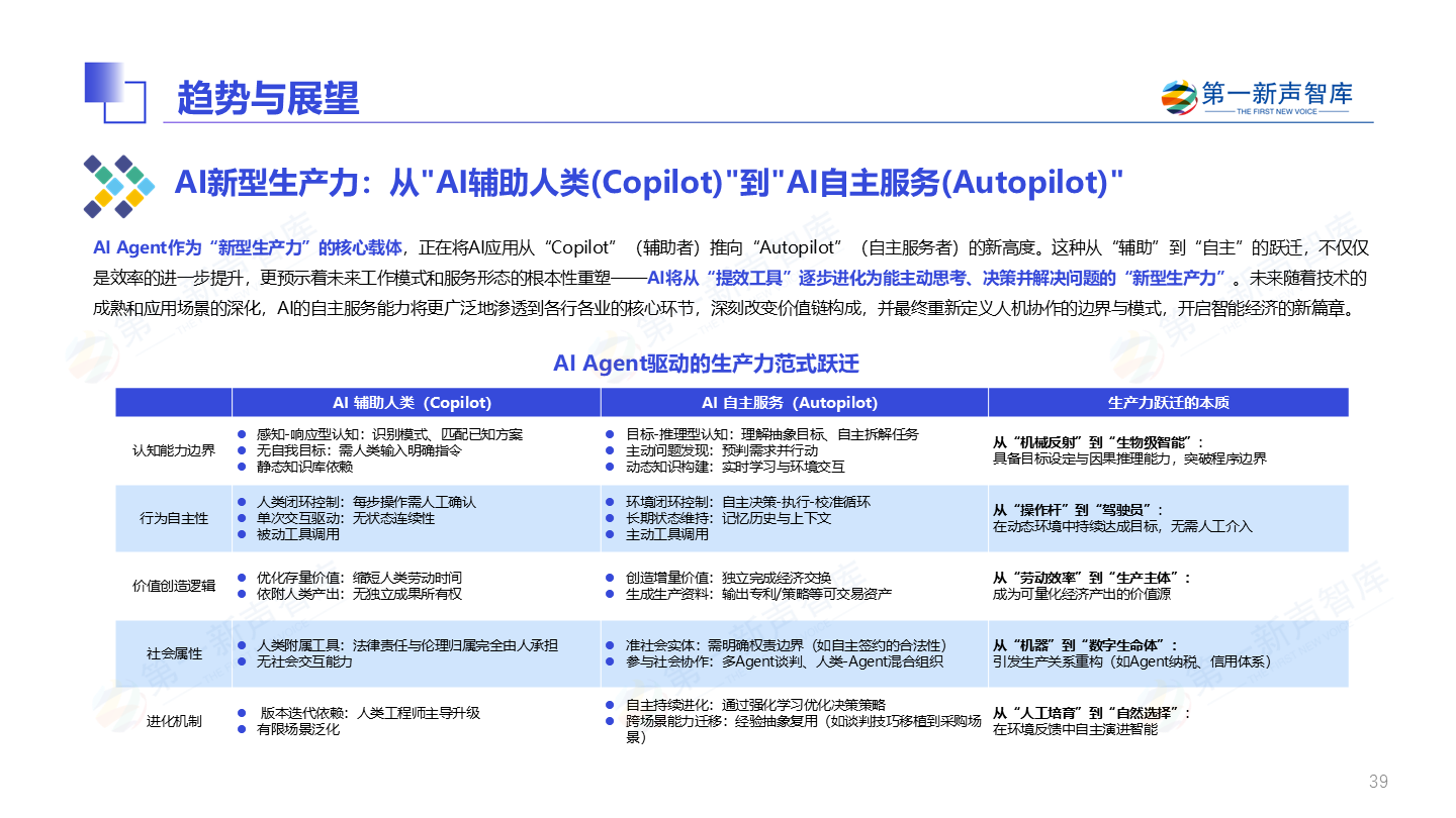 AI Agent作为“新型生产力”的核心载体,正在将AI应用从“Copilot”(辅助者)推向“Autopilot”(自主服务者)的新高度。这种从“辅助”到“自主”的跃迁,不仅仅是效率的进一步提升,更预示着未来工作模式和服务形态的根本性重塑——AI将从“提效工具”逐步进化为能主动思考、决策并解决问题的“新型生产力”。未来随着技术的成熟和应用场景的深化,AI的自主服务能力将更广泛地渗透到各行各业的核心环节,深刻改变价值链构成,并最终重新定义人机协作的边界与模式,开启智能经济的新篇章。