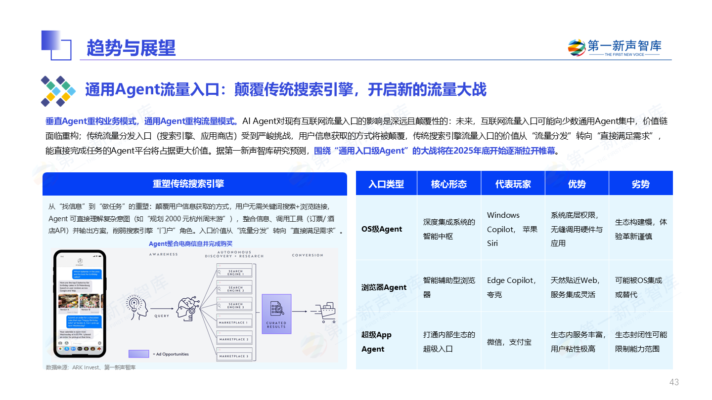 AI Agent对现有互联网流量入口的影响是深远且颠覆性的:未来,互联网流量入口可能向少数通用Agent集中,价值链面临重构;传统流量分发入口(搜索引擎、应用商店)受到严峻挑战,用户信息获取的方式将被颠覆,传统搜索引擎流量入口的价值从“流量分发”转向“直接满足需求”,能直接完成任务的Agent平台将占据更大价值。据第一新声智库研究预测,围绕“通用入口级Agent”的大战将在2025年底开始逐渐拉开帷幕。